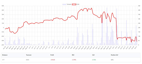 Ну и еще добавлю, никто не захотел покопаться в таблице Bet History через эксель и показать свой РОИ по линии закрытия, а у меня за октябрь такие данные (без учета рынков).